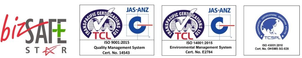 - ISO 9001 and ISO 14001 Certificates which promise quality management for an effective environmental management system. Our ISO 45001 Certificate and bizSAFE STAR Enterprise accreditation further reassure our commitment to deliver exceptional service to you at a safety and healthy workplace.